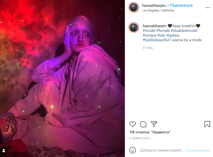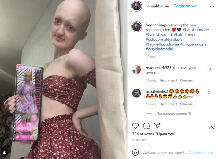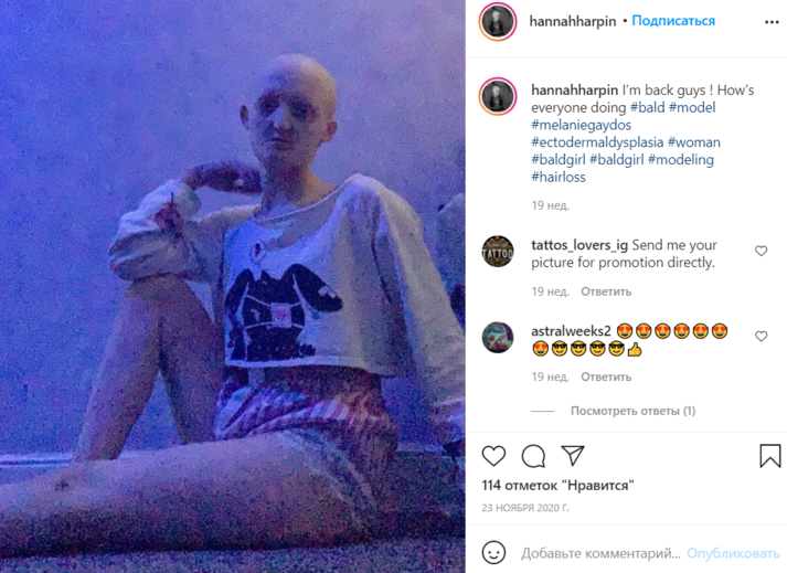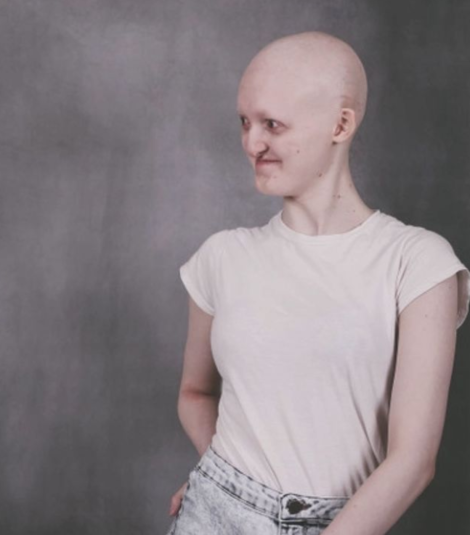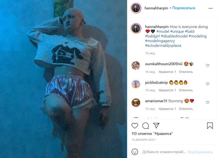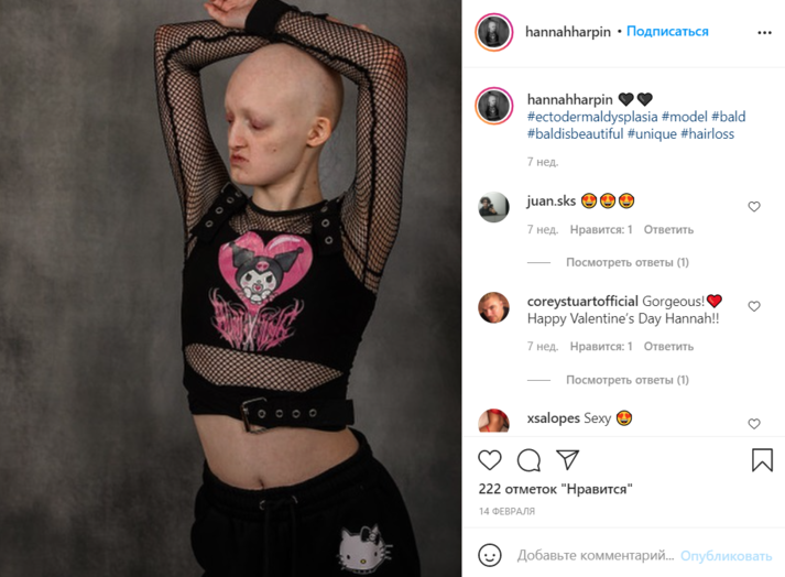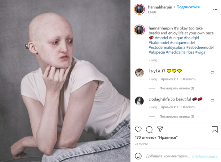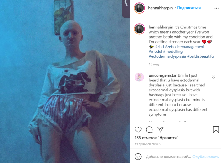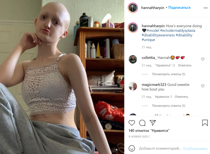 Согласно материалу, 18-летняя Ханна Харпин (Hannah Harpin) родилась с синдромом Хэя-Уэллса, также известным как эктодермальная дисплазия — заболевание, которое приводит к аномальному развитию черепно-лицевых структур и конечностей. Помимо этого девушка страдает от глухоты и алопеции (патологический процесс, характеризующийся нарушением синхронности волосяных циклов и интенсивной утратой волос).