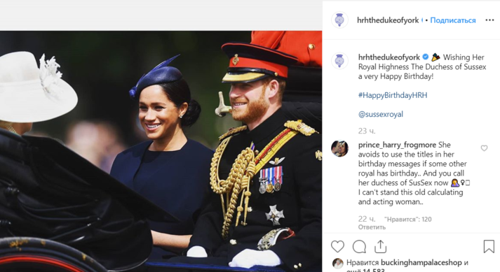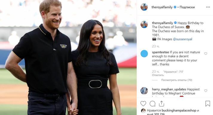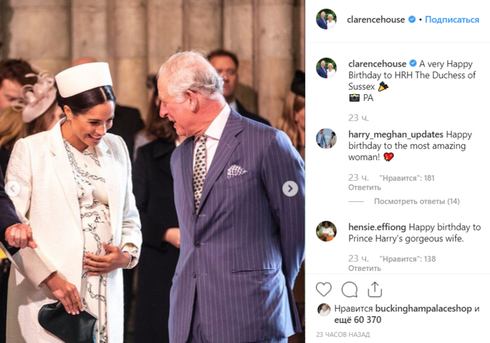 Поздравления Меган появились в официальных аккаунтах королевы Елизаветы II, принца Уильяма и Кейт Миддлтон, принца Чарльза и Камиллы Паркер-Боулз и принца Эндрю.