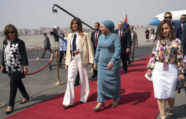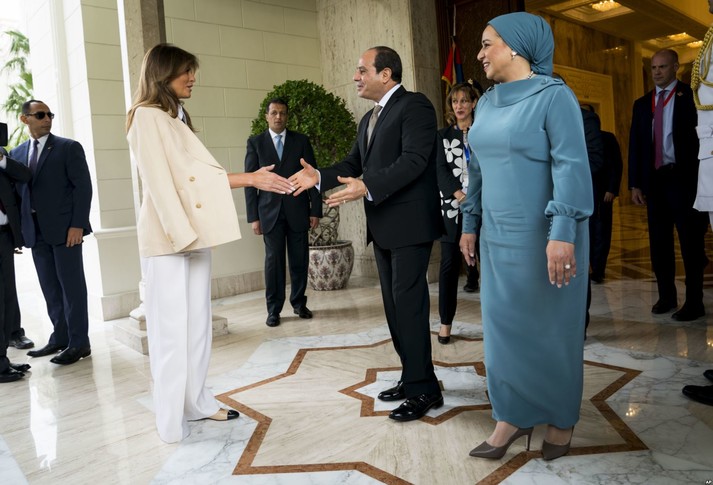 Первая леди США Мелания Трамп прибыла в Каир - столицу Египта утром 6 октября. В аэропорту ее встречали президент Египта Абдул-Фаттах Ас-Сиси и его супруга Энтиссар Мухамед Амер.