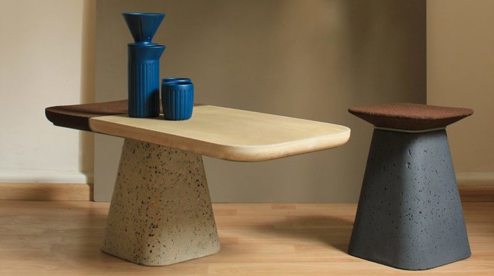 Основа мебели делалось из бетона и черного камня. Дизайнер отмечает, что текстура и твердость материала похожа на нечто среднее между пробкой и MDF (древесноволокнистые плиты средней плотности), но с ароматом кофе.