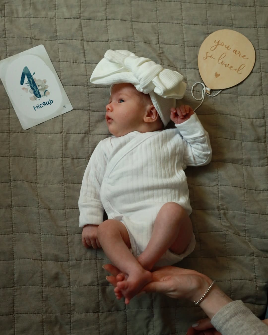 На зображенні крихітка позує у білому боді та з бантиком на голові. Довкола неї видніються святкові декорації.