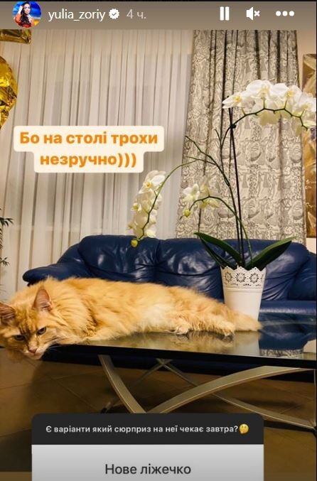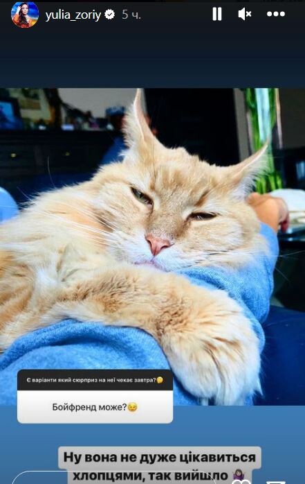 Ведуча телеканалу ICTV Юлія Зорій показала фото домашньої улюблениці. Журналістка має кицьку Алі породи Мейн-кун. Виявляється, Юля щороку не залишає без уваги кішку в Міжнародний день котів, який відзначали вчора, і готує подарунки для неї. Та цього року для Алі зірка підготувала особливий презент: вирішила взяти для своєї улюблениці друга – ще одного кота породи Мейн-кун.