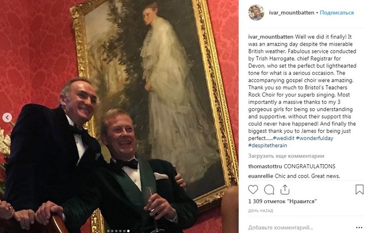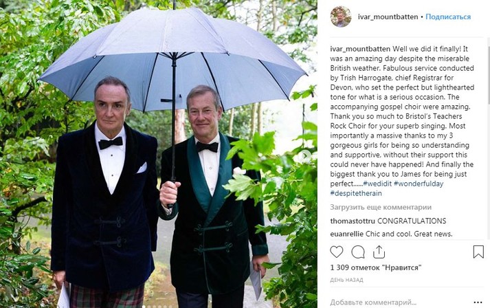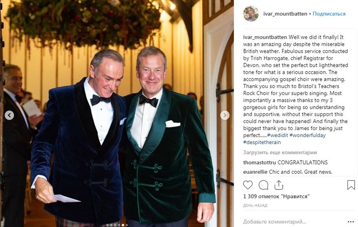 «Мы наконец-то сделали это! Это был потрясающий день, несмотря на ужасную погоду. Невероятный сервис отTrish Harrogate, потрясающий евангельский хор. Огромное спасибо всем. Самое главное - спасибо моим трем великолепным девушкам (три дочери лорда, - прим.ред.) за то, что они так понимают и поддерживают. Без их поддержки этого не случилось бы. И самое большое спасибо - Джеймсу, за то, что он просто идеальный», - трогательно написал Ивар Маунтбаттен.