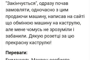 Дехто шуткує, що заради такого незамінного кухонного предмета продав машину, зате каструлю йому особисто передав Макрон. Сміються і з вартості, мовляв така каструля за такі гроші, мов безкоштовно, та ще й зверху доплатили. А також, що би у ній не готувалося – все одно вийде фуа-гра під трюфельним соусом та із золотою присипкою.