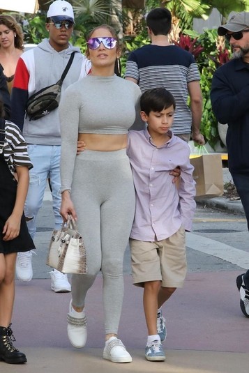 Для семейного выходного певица выбрала спортивный образ, который подчеркнул ее фигуру. Дженнифер надела серые легинсы и кроп-топ. Лопес предпочла белоснежные слипоны, которые украшали крупные стразы. Звезда собрала волосы в пучок, надела солнечные очки с разноцветными стеклами и серьги-кольца. Джей Ло взяла сумку Hermes Birkin.