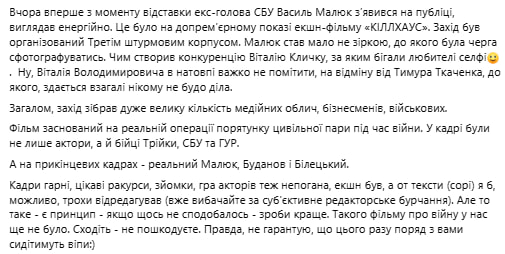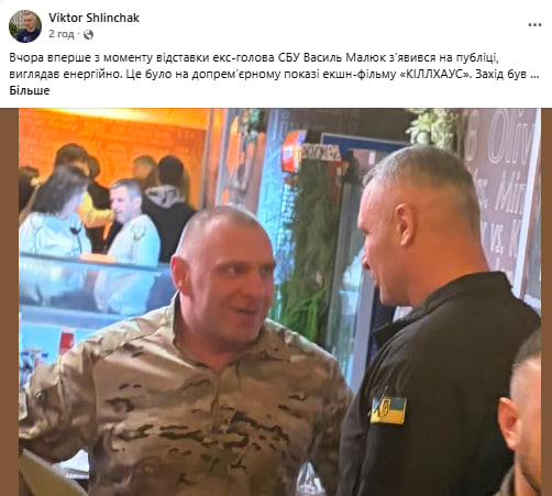 «Учора вперше з моменту відставки ексголова СБУ Василь Малюк зʼявився на публіці, виглядав енергійно. Це було на допрем’єрному показі екшн-фільму «Кіллхаус». Захід був організований Третім штурмовим корпусом. Малюк став мало не зіркою, до якого була черга сфотографуватись», – йдеться в повідомленні.