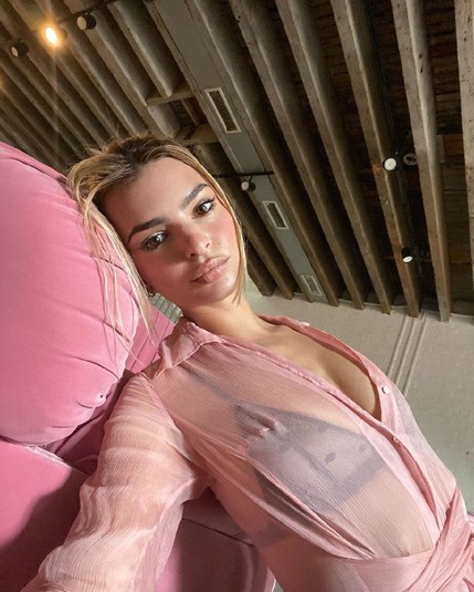 Ратаковски собрала волосы хвост и выпустила впереди две тонкие пряди. Эмили выбрала макияж с акцентом на глаза и помадой пастельного оттенка. Звезда прилегла на розовый диван и показала себя в нескольких ракурсах.