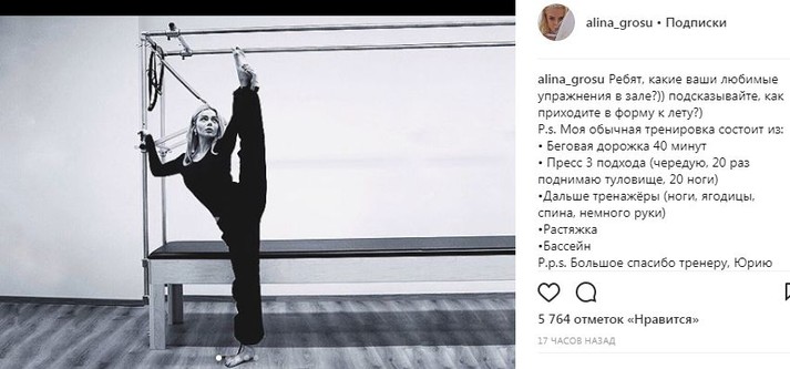 На своей странице в соцсети, Алина Гросу поделилась с поклонниками упражнениями, которые помогают артистке поддерживать фигуру.