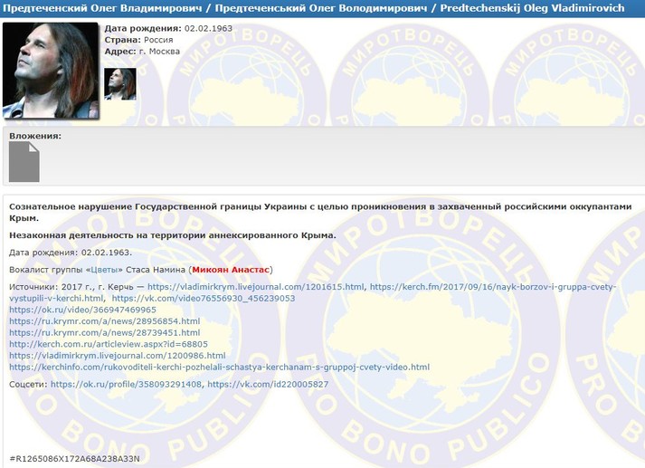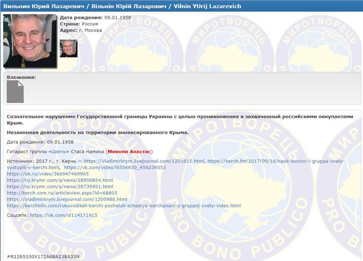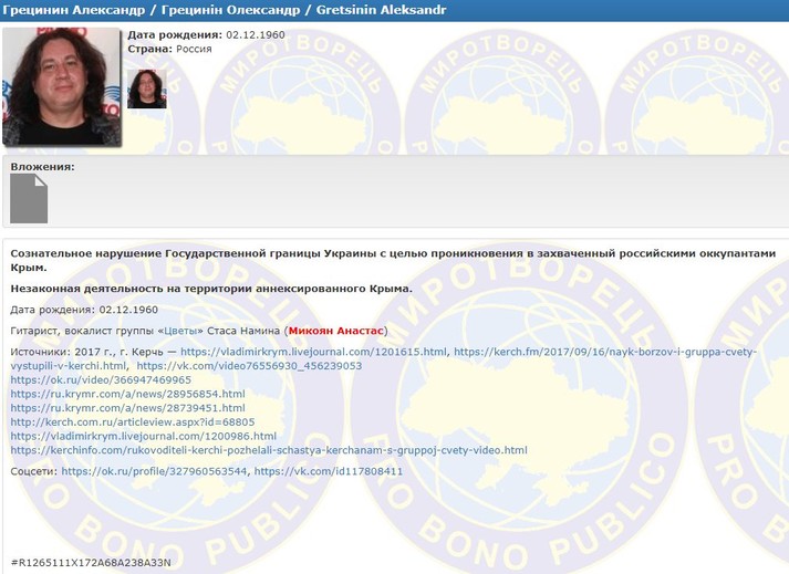 В базу Миротворца внесены: основатель группы «Цветы» Стас Намин (Анастас Микоян), Олег Предтеченский, Александр Грецинин и Юрий Вильнин.
