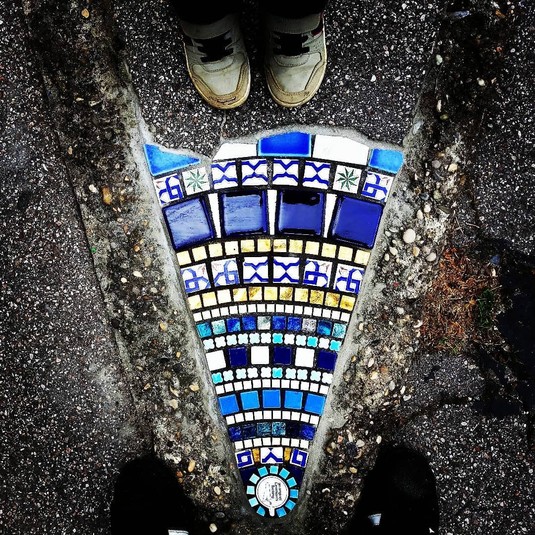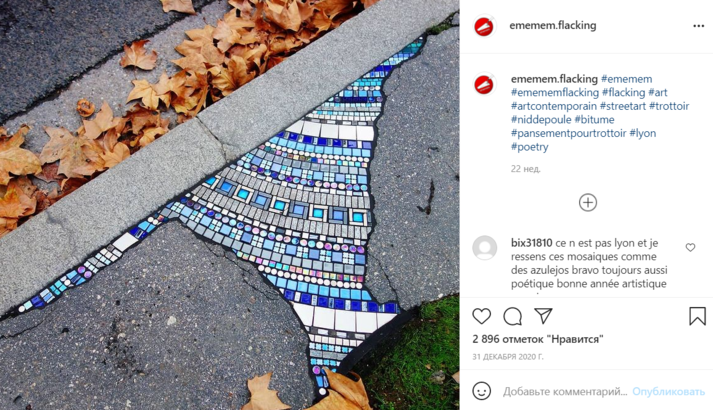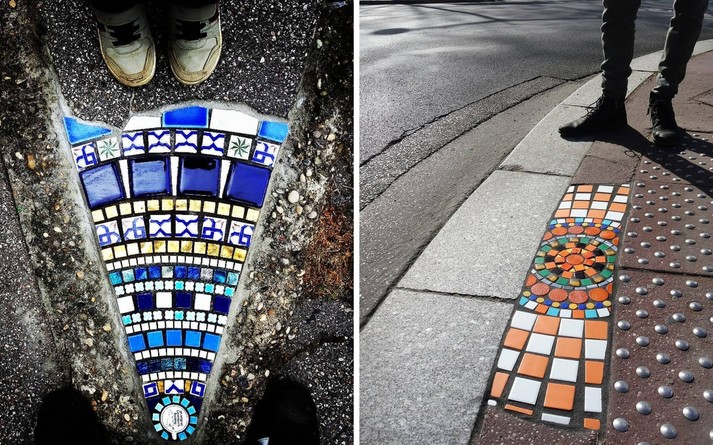 Французский уличный художник Ememem (Эмемем) нашел оригинальный и красивый способ ремонтировать дороги, тротуары и фасады домов в своем родном Лионе. Он закрывает выбоины и трещины яркой мозаикой.