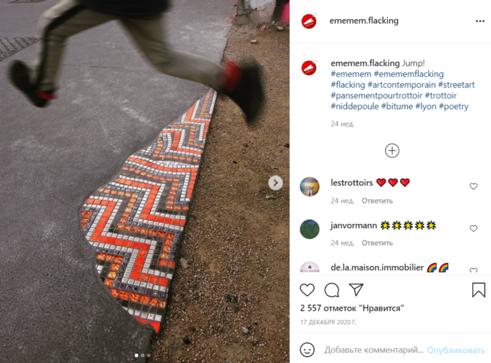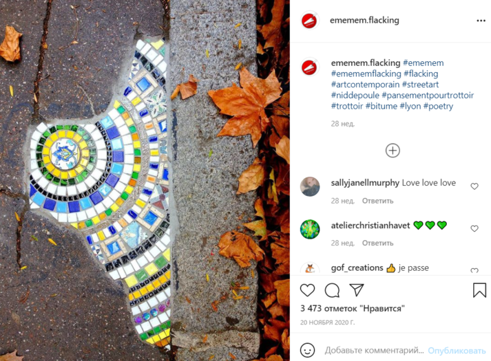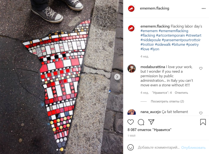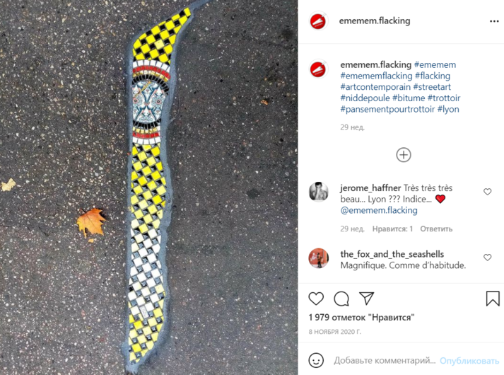 Художник стал известен как «дорожный хирург», а свою технику он назвал «Flacking». По словам Ememem, «Flacking» означает появление нового повреждения и его художественное восстановление. Можно сказать, что у француза есть миссия: залатать каждый разбитый тротуар и фасад дома в своем городе, заполнив выбоины красочными произведениями искусства, которые радуют всех прохожих, пишет Good News Network.