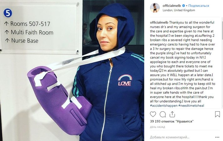 3-летняя британская певица Мелани Браун оказалась в больнице с переломами двух ребер и серьезным повреждением руки. Как рассказала певица подписчикам в своем Instagram, ей пришлось пережить 3-часовую операцию.