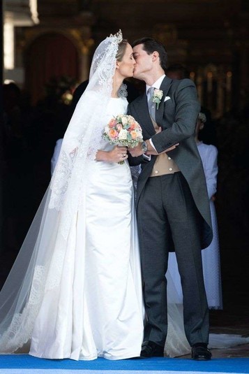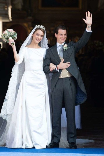 На торжественной церемонии герцогиня София была в элегантном и сдержанном платье с рукавами три четверти и длинным шлейфом, управляться с которым королевской особе помогали маленькие пажи. Нежный образ невесты дополняла кружевная фата, тиара, украшенная драгоценными камнями, и букет из разноцветных роз. Граф Максимилиан появился на собственной свадьбе в темно-сером костюме-тройке и бело-синем галстуке.