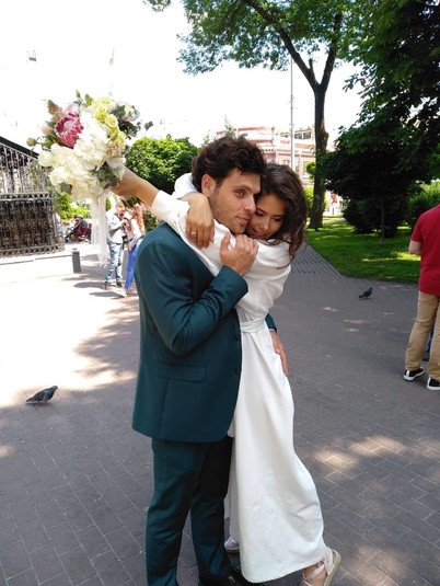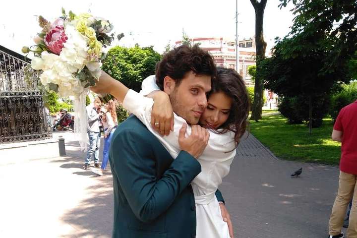 Расписались в Печерском загсе, а отмечали в ресторанчике на территории киностудии Film.ua. Выбор локации не случайный, пара училась в местной киношколе. Для торжества невеста выбрала белоснежное платье-вышиванку с национальным орнаментом и поясом, на ногах – белые босоножки. Жених был в зеленом костюме. На безымянных пальцах – кольца из белого золота… Не обошлось на торжество без давней телевизионной и киношной традиции. Чтобы «проект» был успешным, долгим и счастливым перед его стартом ребята разбили тарелку.