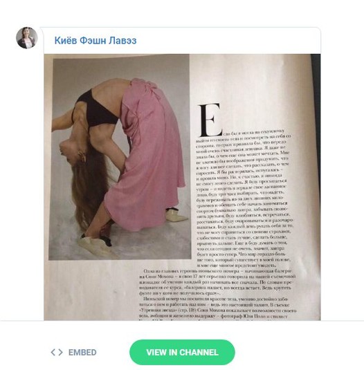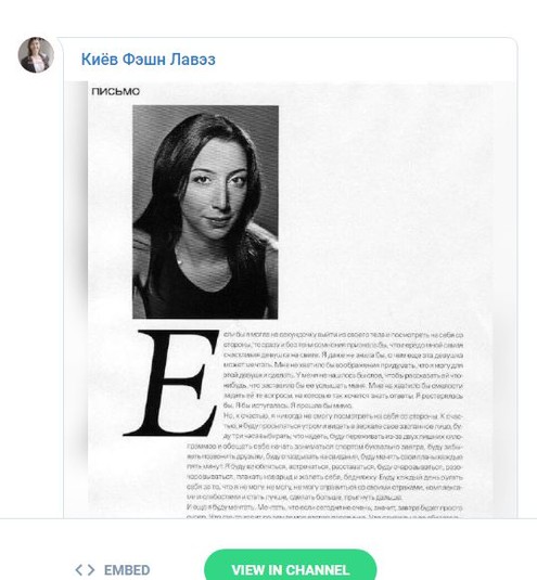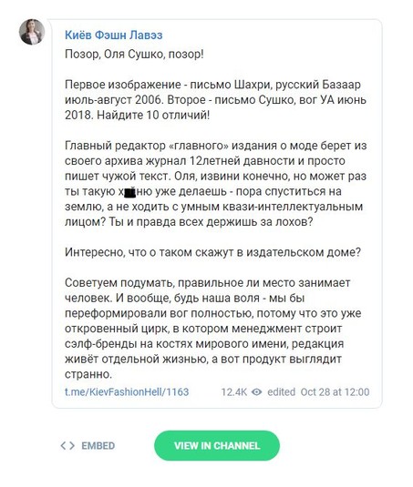 Все тот же telegram-канал «Киев Фэшн Лавэз» и пользователи соцсетей нашли еще девять текстов которые заимствованы у других журналистов и были опубликованы в колонке редактора журнала Vogue Ukraine.