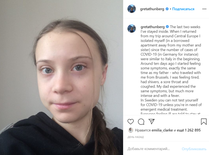 «Я вернулась из центральной Европы около двух недель назад и сразу же изолировала себя, поскольку путешествовала на поездах, - заявила Грета. - Я не хотела никого подвергать риску. Около 10 дней назад я почувствовала симптомы Covid-19 и на время прекратила общение с мамой и сестрой. Мой отец тоже нездоров, у него болезнь протекает более серьезно».