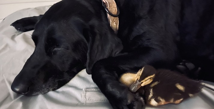 Черный лабрадор-ретривер по кличке Красавица души не чает в своих пернатых друзьях — утках Кресс, Дауни и Дот. Собака любит их настолько сильно, что ради их спасения она была готова сразиться с аллигатором.