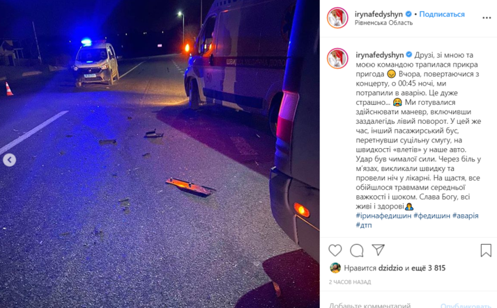 Популярная украинская певица Ирина Федишин попала в ДТП. Как рассказала исполнительница в своем Инстаграме, инцидент произошел сегодня ночью в пгт. Здолбунов в 10 километрах от Ровно, когда она со своей командой возвращалась с концерта из Шепетовке домой.