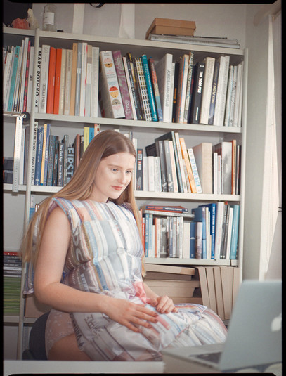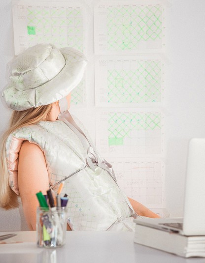 Все материалы для коллекции она нашла в собственном доме, где переживала карантин: это были остатки от других ее работ, а на набивку пошли старые одеяла. Принты на ткани она печатала на обычном принтере: это фотографии ее домашней библиотеки и календарь, где дни самоизоляции зачеркнуты зеленым маркером.