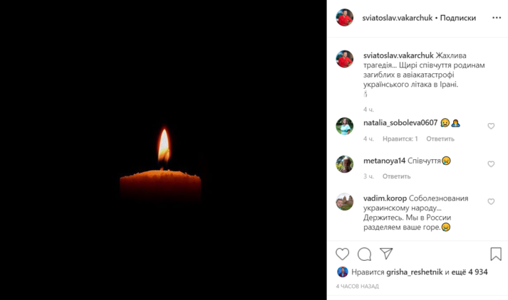 «Время крепко держаться за руки. Искренние соболезнования семьям... Ходят слухи, что самолёт ошибочно сбили иранские военные. Вы верите в такую версию?», - написал Остапчук.
