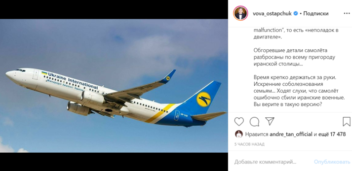 Украинский телерадиоведущий Владимир Остапчук также отметился постом в Инстаграме о трагедии украинского лайнера. По словам знаменитости, он про шерстил британские СМИ в поисках информации о деталях трагедии, но зачем-то повторил фейк, массово тиражированный украинскими пользователями в соцсетях.