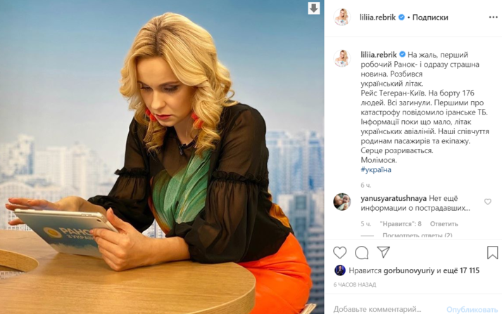 Известную телеведущую Лилию Ребрик страшная новость застала на работе. Телезвезда выразила соболезнования семьям погибших в авиакатастрофе.