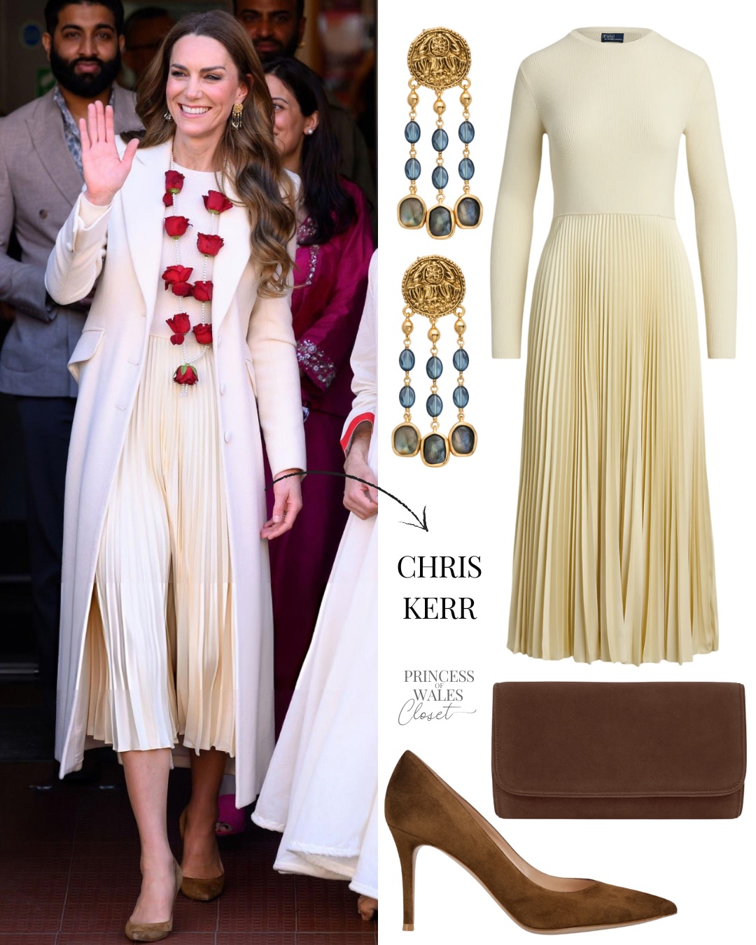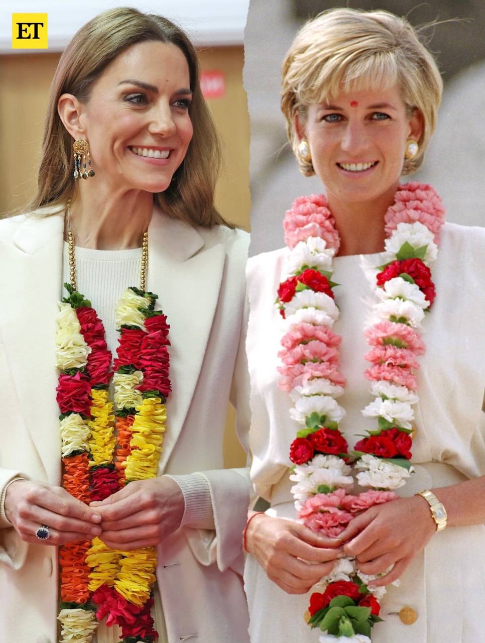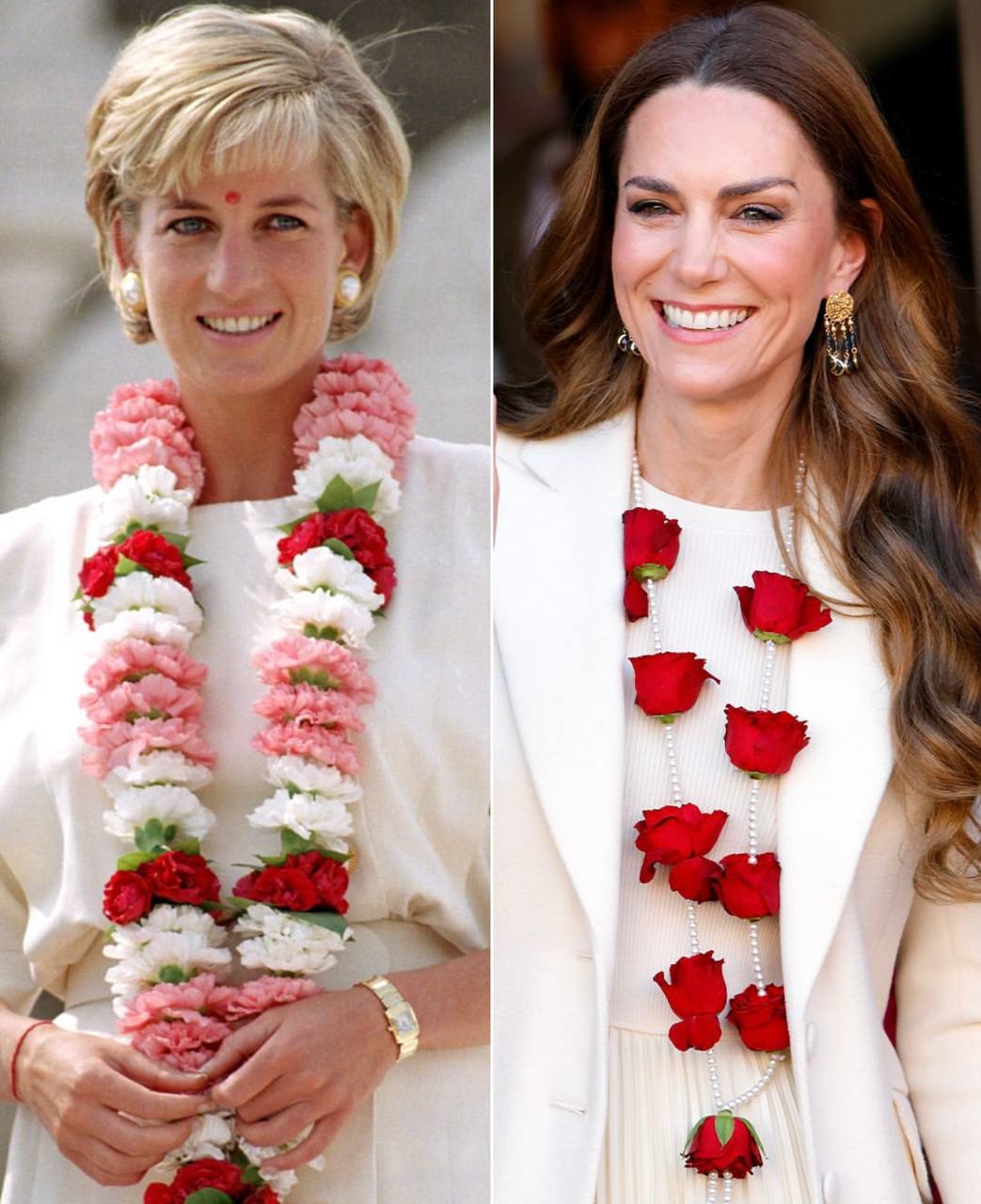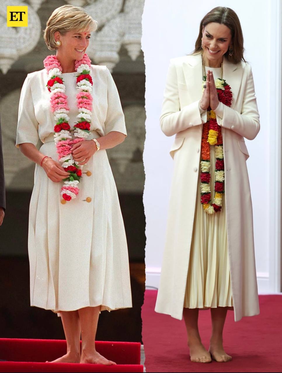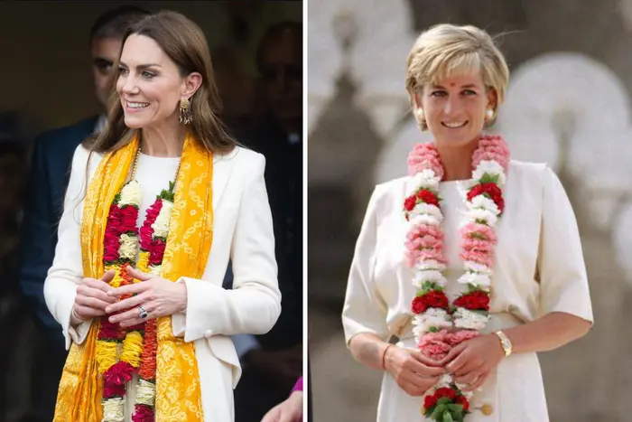 Зовнішній вигляд Кейт Міддлтон нагадує образ принцеси Діани під час її візиту до індуїстського храму та те, як вона спілкувалися з членами громади. На фото можна побачити принцесу Уельську у білому пальто, сукні та з квітковою гірляндою на шиї.