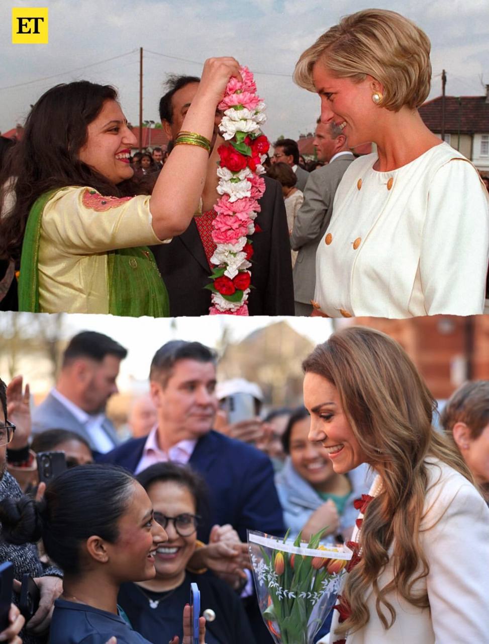 Крім схожого одягу та елементів, можна також побачити схожість між Кейт та Діаною в їхній поведінці та ставленні до народу. На кадрах обидві принцеси щиро вітають людей, спілкуються з ними та не приховують посмішки.
