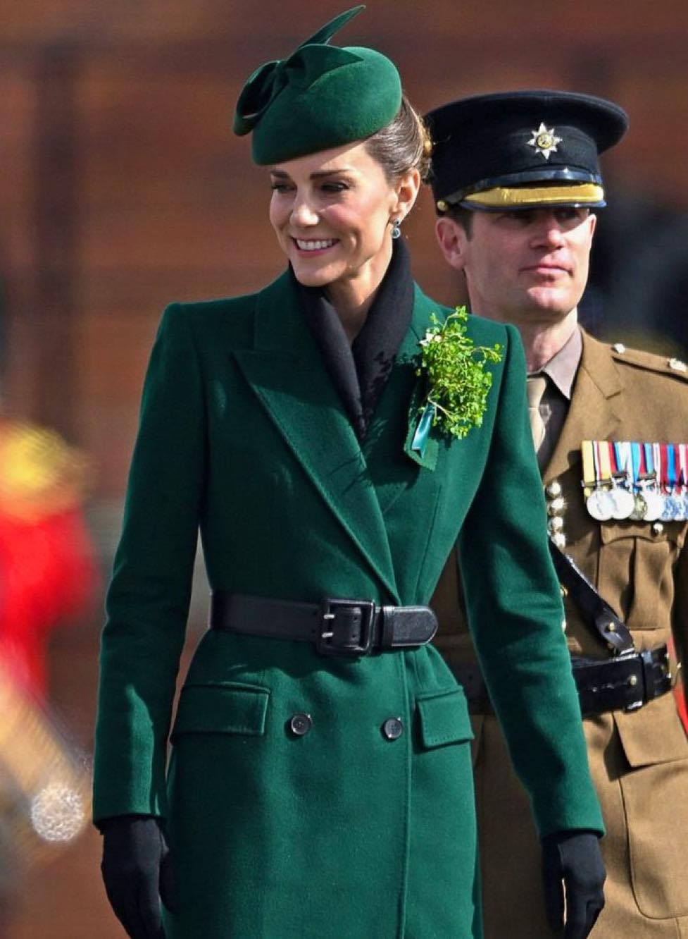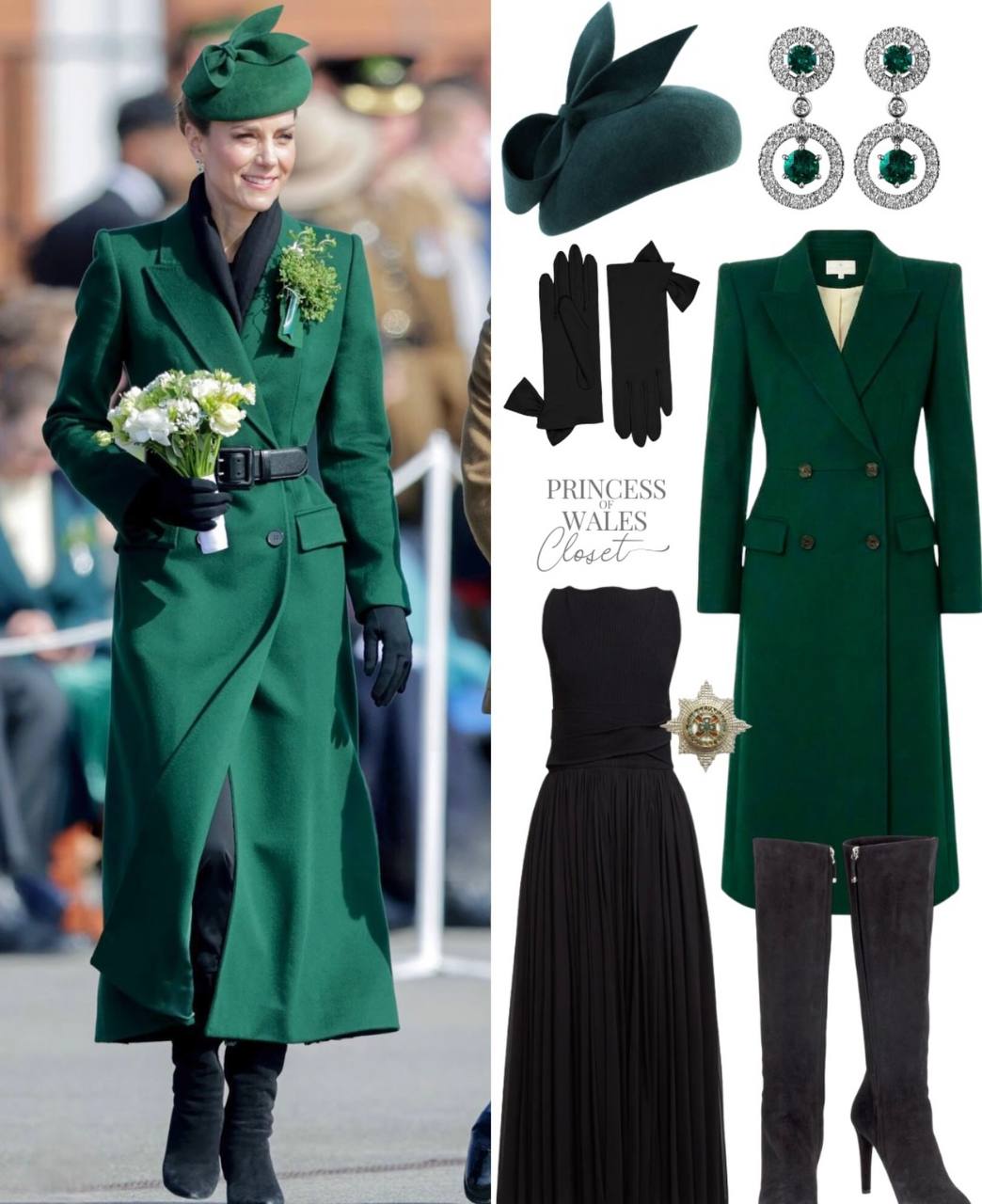 На параді принцеса Уельська у з’явилася витонченому смарагдовому вбранні. Вона обрала для заходу смарагдове довге пальто від Alexander McQueen, також від цього бренду принцеса одягла довгу чорну сукню. Її образ доповнив берет від Gina Foster Millinery, рукавички від Cornelia James та брошка Ірландської гвардії. А взуття Кейт Мідлтон обрала від відомого бренду Ralph Lauren.