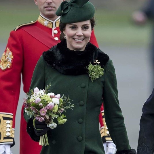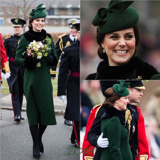 Как правило, всегда в этот день одетая в наряд зеленого цвета, герцогиня Кембриджская и на этот раз не отошла от традиции - на публике она появилась в зеленом пальто от Alexander McQueen, украшенном брошью в виде трилистника от Cartier, шляпке от James Lock&Co и черных туфлях на устойчивом каблуке от Gianvito Rossi. В качестве аксессуаров она выбрала серьги стоимостью 4,7 тысячи долларов от британского бренда Kiki McDonough. Принц Уильям, который является полковником ирландской гвардии, был одет в парадную военную форму.