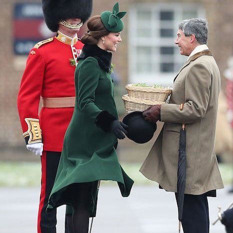 Не обошлось и без другого обычая, которому Кейт Миддлтон следует каждый год (он берет свое начало с 1901 года) - она вручила офицерам ветки трилистника, а также тепло приветствовала ирландского волкодава по кличке Доннелл, который является символом ирландской армии и возглавляет процессию.