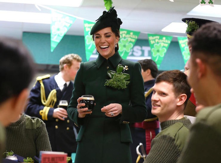 Перед тем как чествовать военнослужащих, герцог и герцогиня Кембреджские побывали на ежегодном параде Ирландской гвардии. Для мероприятия Кейт выбрала образ в главном цвете праздника, надев темно-изумрудное пальто и шляпку в тон.