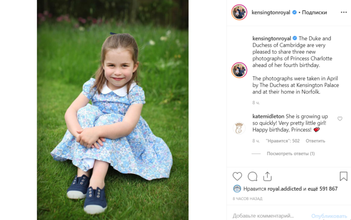 «Герцог и герцогиня Кембриджские рады представить вам новые фотографии принцессы Шарлотты в преддверии ее праздника», - написала Кейт.