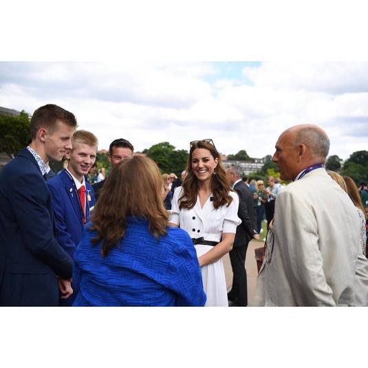 Кейт появилась в белоснежном платье-халате от Alexander McQueen с контрастными черными пуговицами, ремешком и брошью. Образ дополнили сумочка от этого же бренда, а также туфли Piper 85 от Gianvito Rossi, стоимостью £520. Из украшений Кейт выбрала серьги «Золотой папоротник» от Catherine Zoraida за 150 фунтов стерлингов.