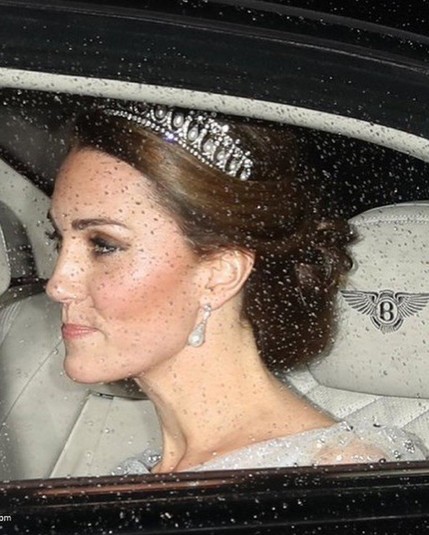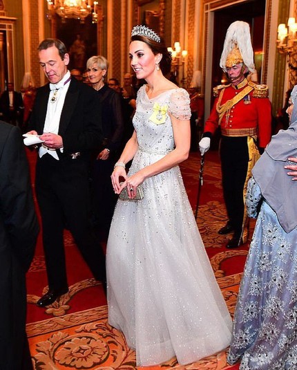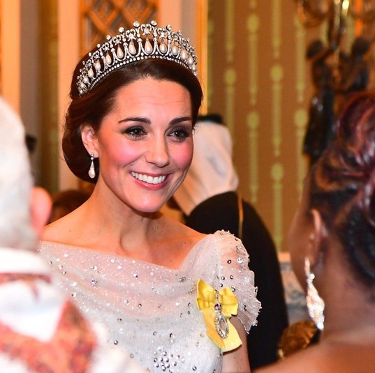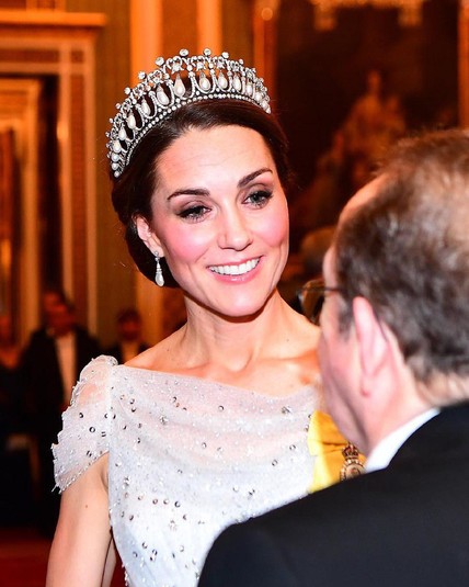 Герцогиня Кембриджская была облечена в ослепительный вечерний наряд. Образ дополнили любимые украшения: тиара «Узелки любви» и жемчужные серьги, принадлежавшие принцессе Диане. Знаменитую тиару принцесса Уэльская тоже любила надевать, как и Елизавета II, а теперь супруга принца Уильяма готовится к будущему статусу королевы.