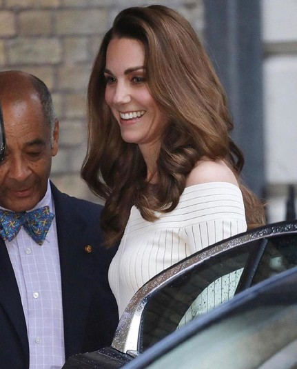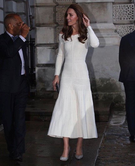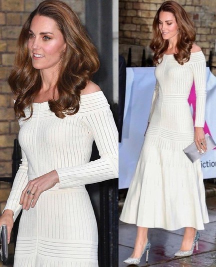 Для посещения лондонского ресторана, где проходил ужин, Кейт, известная также тем, что предпочитает надевать полюбившиеся наряды, в этот раз появилась в белом платье в тонкую серую полоску от бразильского дизайнера Барбары Касасола. В предыдущий раз это платье было на Миддлтон летом 2016 года, когда она приехала на вручение премии «Музей года».