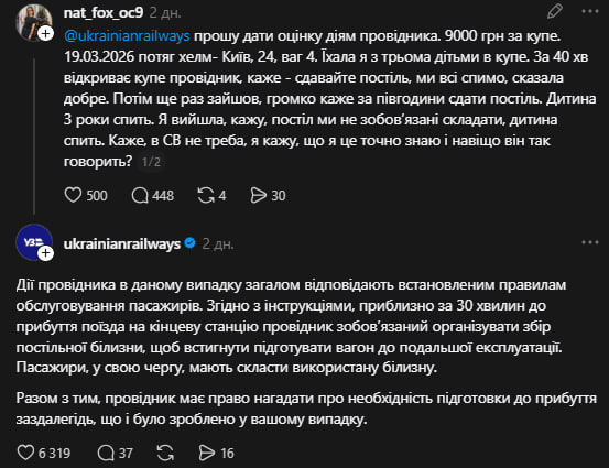 «Дії провідника в даному випадку загалом відповідають встановленим правилам обслуговування пасажирів. Згідно з інструкціями, приблизно за 30 хвилин до прибуття поїзда на кінцеву станцію провідник зобов’язаний організувати збір постільної білизни, щоб встигнути підготувати вагон до подальшої експлуатації. Пасажири, у свою чергу, мають скласти використану білизну. Разом із тим, провідник має право нагадати про необхідність підготовки до прибуття заздалегідь, що й було зроблено у вашому випадку», – пояснили в «Укрзалізниці».