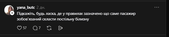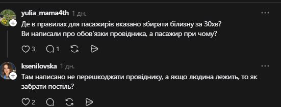 - «Я, навпаки, ніколи не бачила, щоб люди щось там носили. Завжди провідники ходять і збирають. Де в правилах для пасажирів вказано збирати білизну за 30 хв? Ви написали про обов’язки провідника, а пасажир при чому?»