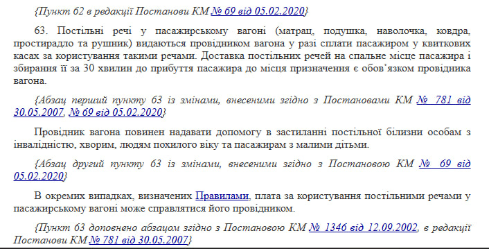 «Постільні речі в пасажирському вагоні (матрац, подушка, наволочка, ковдра, простирадло та рушник) видаються провідником вагона в разі сплати пасажиром у квиткових касах за користування такими речами. Доставка постільних речей на спальне місце пасажира і збирання її за 30 хвилин до прибуття пасажира до місця призначення є обов’язком провідника вагона», – йдеться в постанові.