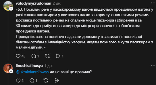 - «Нащо ви, «Укрзалізниця» пишете так, якби пасажир повинен здати білизну. Пасажир не має складати використану білизну. Обовʼязок збирати постіль покладається на провідника. Перечитайте п.63».