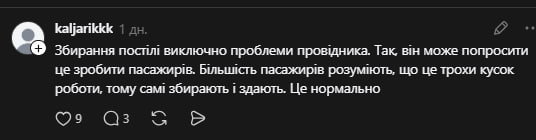 Також користувачі вказали на 63 пункт постанови про Порядок обслуговування громадян залізничним транспортом. У ній зазначається, що збирання постелі за 30 хвилин до прибуття пасажира до місця призначення є обов’язком провідника вагона.
