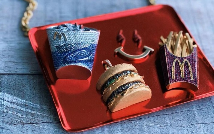 Кроме большого подноса с полным комбо дизайнер создал подвески с отдельными его элементами. Украшенные кристаллами миниатюрные бургер, картофель фри и молочный коктейль действительно получились очень похожими на прототипы.