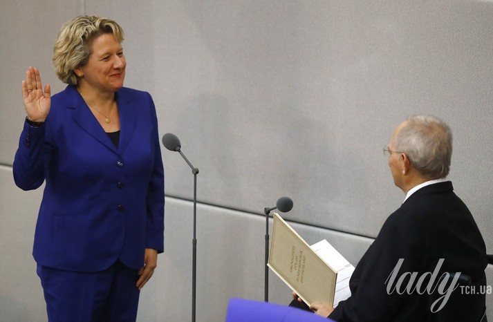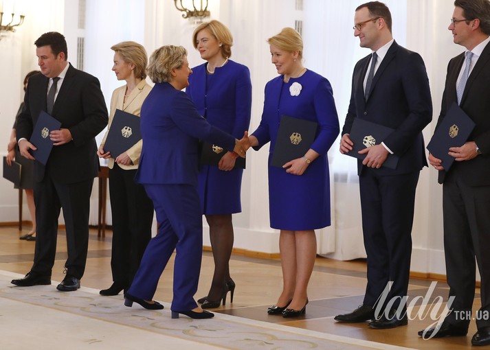 Кроме них в синем наряде также была 49-летний министр охраны окружающей среды Свенья Шульце. Она выбрала брючный костюм.