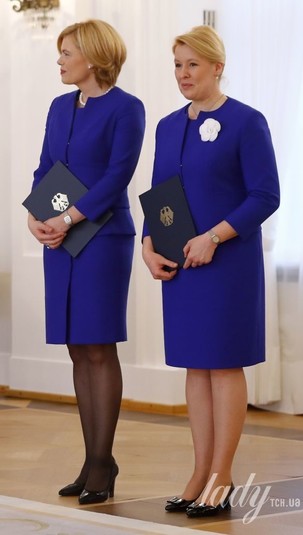45-летний министр сельского хозяйства Юлия Клекнер и 39-летний министр по делам семьи, пожилых людей, женщин и молодежи Франциска Гиффай пришли в одинаковых синих платьях, поверх которых надели жакеты.