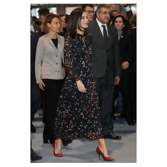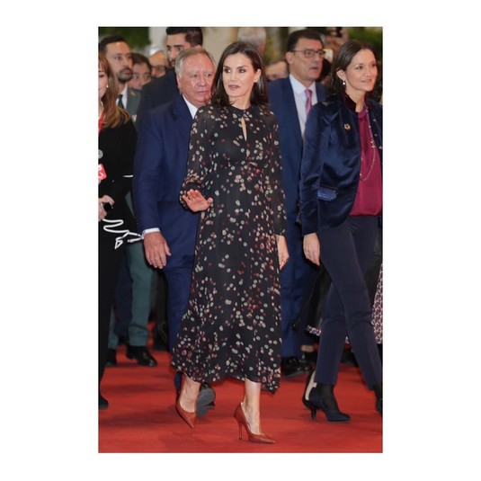 Например, для недавней своей встречи с представителями киноиндустрии Летиция выбрала черно-красный ансамбль из вещей Carolina Herrera и Hugo Boss. Этот наряд мы тоже видели раньше на королеве - во время ее рабочей поездки в Севилью.