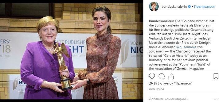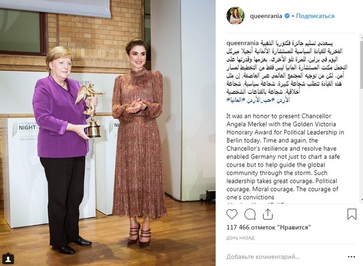 Королева Рания - одна из самых ярких женщин арабского мира, выступающих на мировой трибуне. Будучи супругой короля Иордании, она активно участвует в политических и социальных миссиях монархии, а также представляет интересы Востока за пределами своей страны. Вчера она побывала в Берлине и выступила на церемонии Golden Victoria Honorary Award, вручив награду канцлеру Германии Ангеле Меркель. Со сцены Рания отметила мужество Меркель, ее твердую приверженность обеспечению стабильности, свободы и мира, а также отметила ее работу по урегулированию кризиса беженцев.