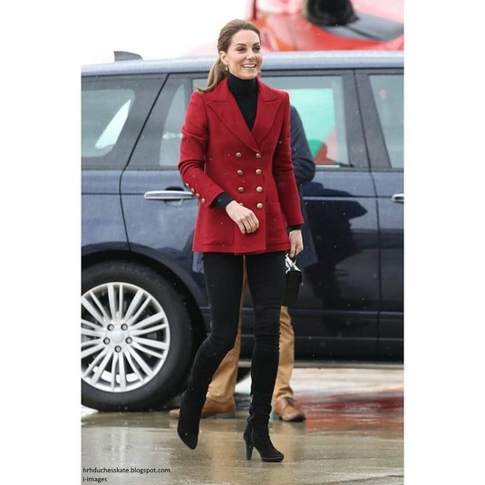 Кейт не первый раз появляется в узких брюках, заправленных в сапоги. Поверх черной водолазки (как раз предмет классики) она надела двубортный жакет малинового цвета бренда Philosophy с золотыми пуговицами. По-настоящему модная вещь, которая стала ярким акцентом и украсила выход супруги принца.