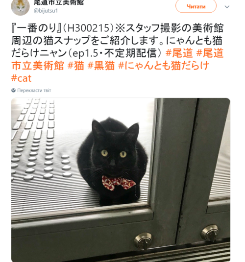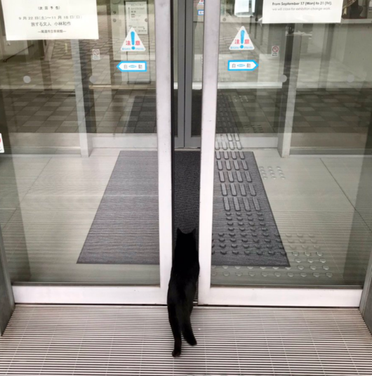 Японский художественный музей Ономити известен не только своим экспонатами, но и двум уличным котам, которые годами пытаются зайти внутрь. Летом 2016 в заведении проходила выставка фото домашних животных, которая заинтересовала черного кота, живущего неподалеку. Он попытался зайти в музей, однако в последний момент его не пустила охрана.