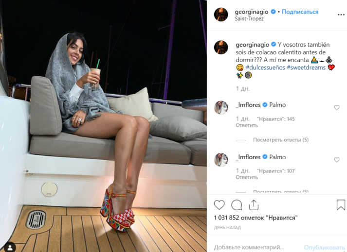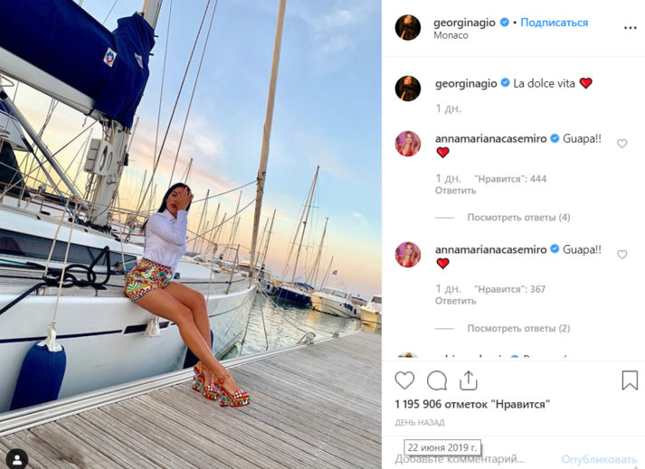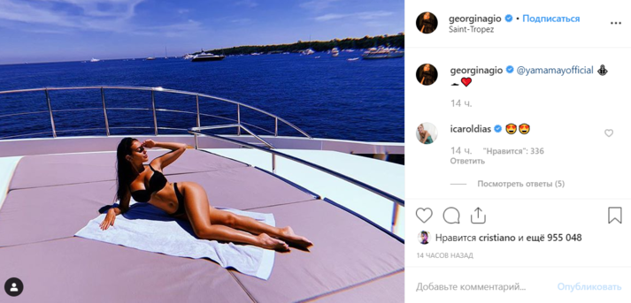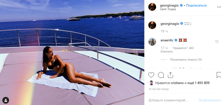 Криштиану и Джорджина плавали и загорали, наслаждаясь роскошными видами французской Ривьеры. Возлюбленная спортсмена выбрала эффектный образ для фотосессии. Она подчеркнула длинные стройные ноги ультракоротким платьем и босоножками на высоком каблуке.