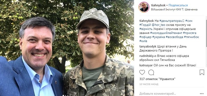 По словам лидера ВО «Свобода» Олега Тягнибока, вчера его сын Гордей принял присягу на верность Украине и получил первое офицерское звание - младший лейтена́нт.